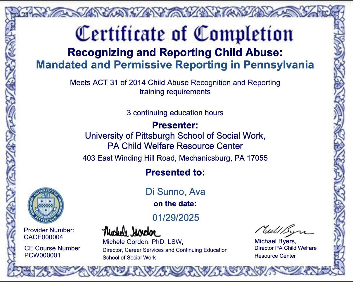 Please contact avld01260@gmail.com for a copy of Ava Di Sunno’s NY & PA clearances